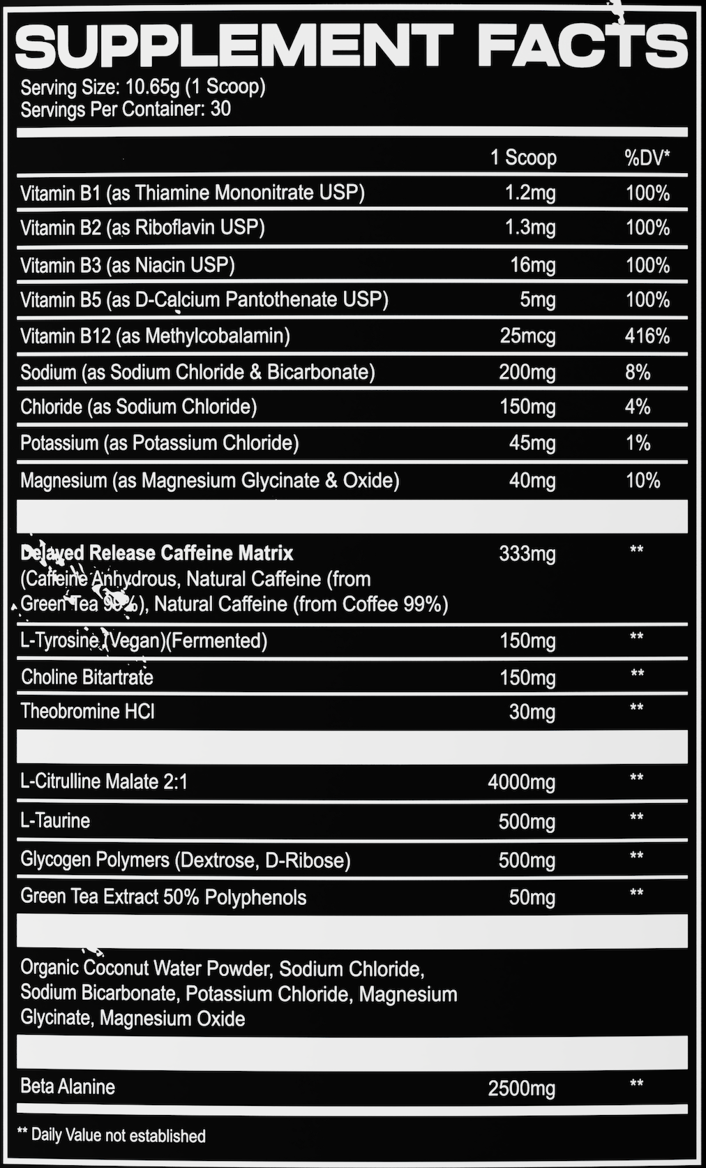 The L-Citrulline Malate and Beta-Alanine pairing promotes enhanced blood flow, muscular endurance, and performance longevity — helping you push harder, recover faster, and perform stronger with every workout. Electrolytes and coconut water powder maintain hydration, while glycogen polymers support energy restoration and recovery.
