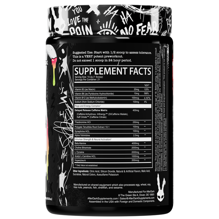 Engineered with the Rage and Energy Complex, INHUMAN delivers 400mg of delayed-release caffeine to keep your fire lit from the first rep to the final drop of sweat. Beta-Alanine and L-Citrulline flood your system with endurance, while L-Tyrosine, Choline, and Huperzine A crank your focus into overdrive. Theobromine, Synephrine, and Yohimbine turn up the heat — literally.
